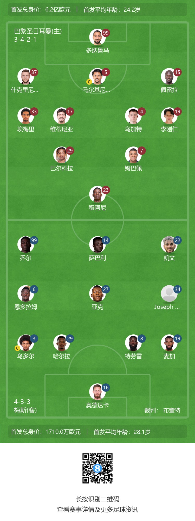 巴黎首发:99-多纳鲁马、15-达尼洛、5-马尔基尼奥斯、37-什克里尼亚尔、29-巴尔科拉、33-埃梅里、4-乌加特、17-维蒂尼亚、23-穆阿尼、19-李刚仁、7-姆巴佩
