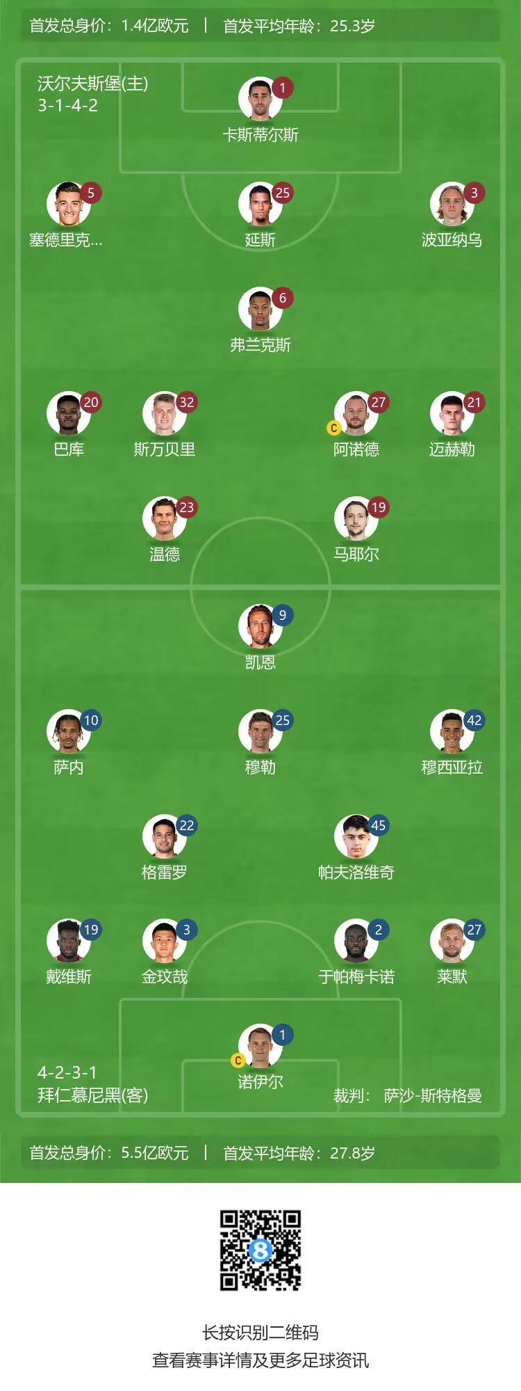 拜仁vs沃尔夫斯堡首发:凯恩领衔 穆勒、穆西亚拉出战