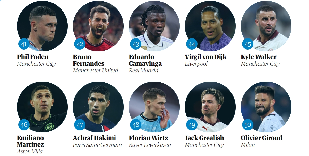 卫报年度百大球星41-70位:B费42、大马丁46、奥纳纳62、克罗斯70