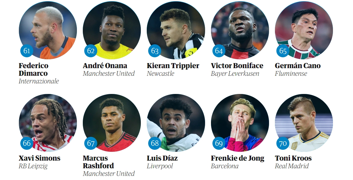 12月21日讯 英媒《卫报》评选了2023年百大球星,今日公布第41-70名。前40名将会在未来陆续公布。