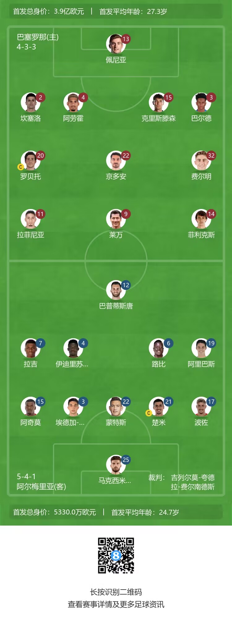 12月21日讯 西甲第18轮,巴萨主场对阵阿尔梅里亚。赛前,官方公布了本场的首发名单。