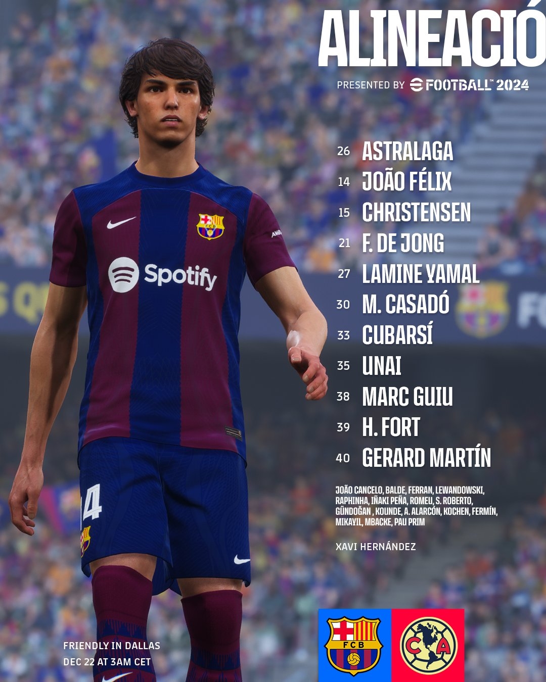 12月22日讯 友谊赛,北京时间今天早上10点,巴萨vs墨西哥美洲,目前首发已经公布。本场比赛地点为美国达拉斯棉花碗球场。