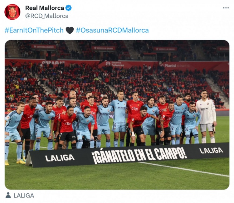 西甲本轮转播信号右下角贴上了反欧超标语水印——“Earn It On the Pitch”(在球场上赢得)。