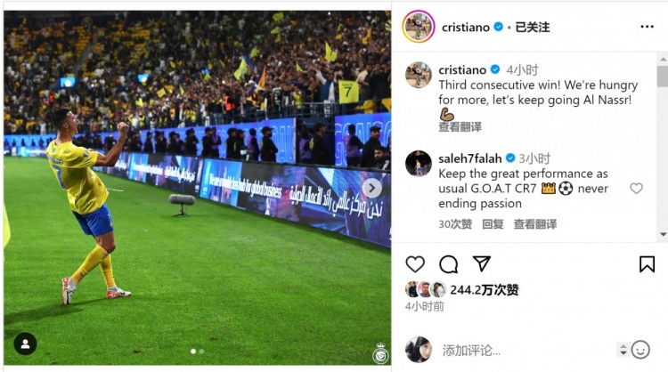 赛后C罗在社交媒体上晒出自己庆祝的照片,并写道:“三连胜!我们渴望更多,让我们继续前进,利雅得胜利!”
