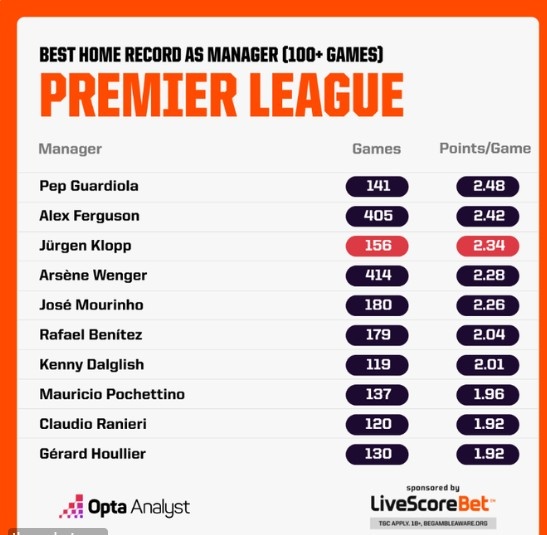 执教英超主场均分排名:瓜帅2.48分第一,弗格森、克洛普二三位