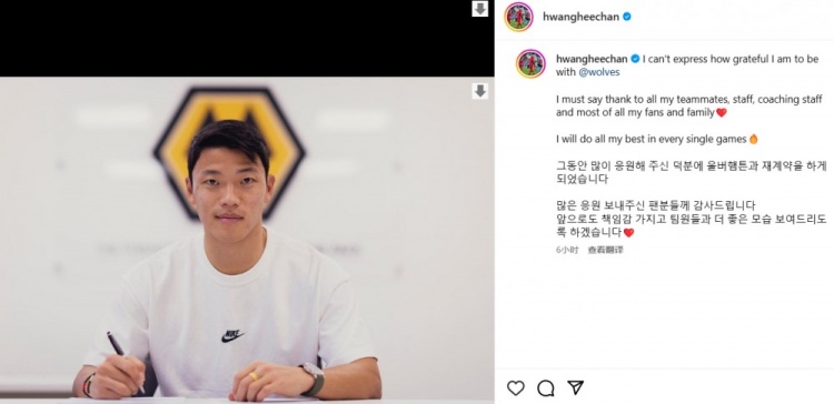完成续约后,黄喜灿更新了社媒动态:“我无法表达对于和狼队在一起的感激之情。我必须感谢所有的队友,工作人员,教练组成员以及我所有的球迷和家人们。