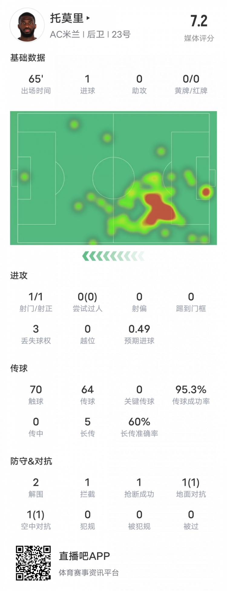 托莫里本场对阵萨勒尼塔纳数据:破门+伤退&2解围1拦截,评分7.2