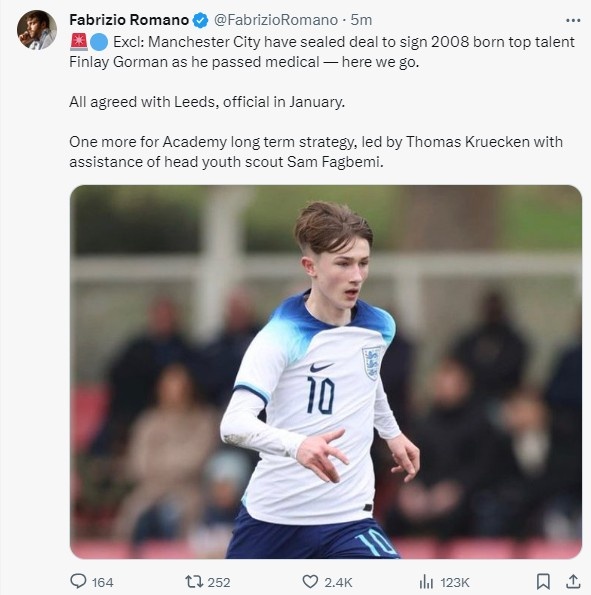 罗马诺:曼城从利兹联敲定签下15岁中场戈尔曼,1月正式官宣