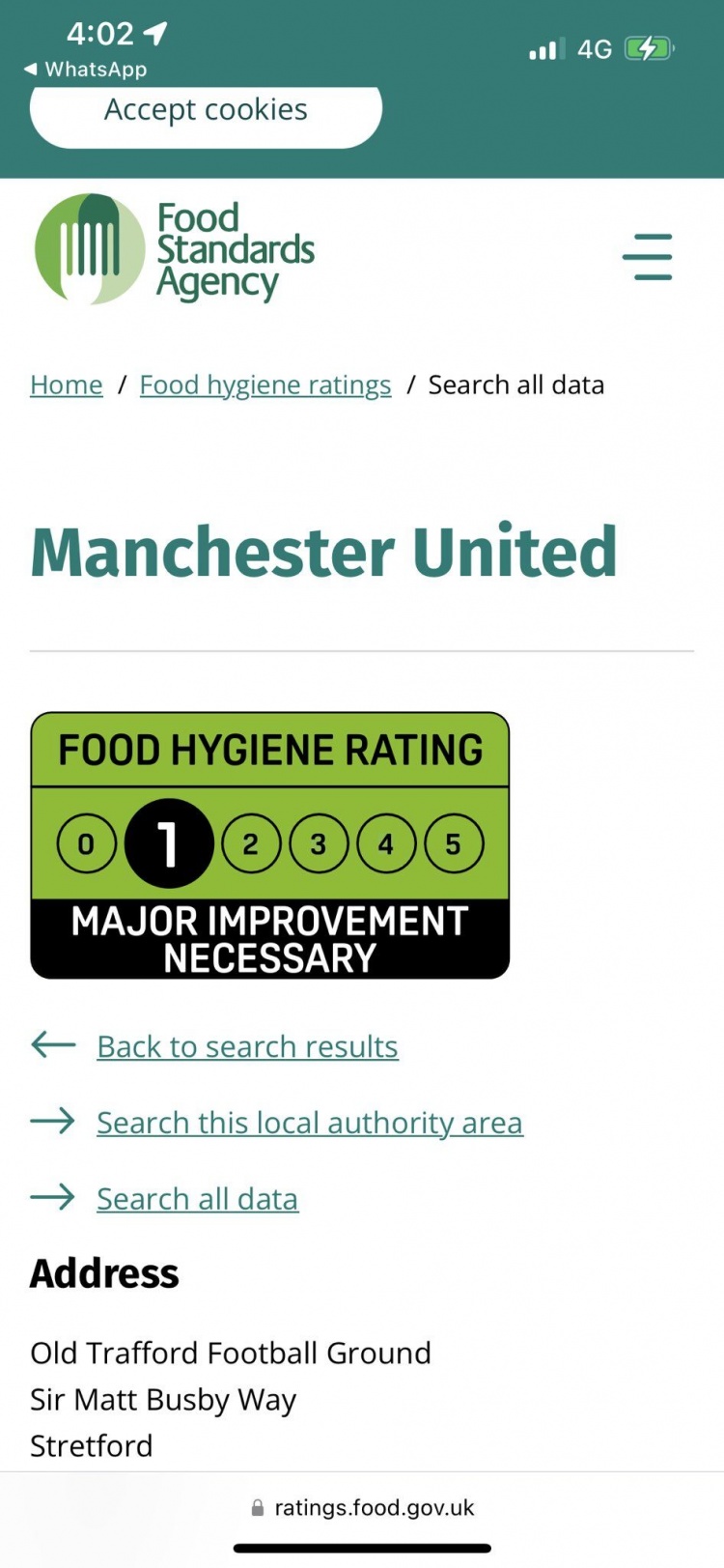 特拉福德议会的一名发言人表示:“我们可以确认,老特拉福德的食物卫生评级从5级下降到了1级。这是由于11月21日,曼联供应了没有煮熟的食物,相关部门对其展开了食物卫生检查。”
