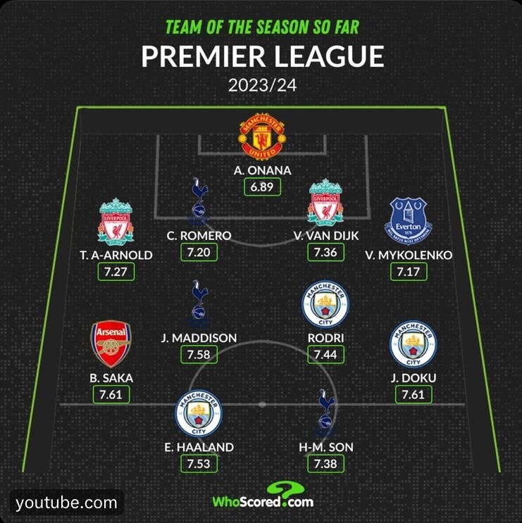 12月23日讯 目前,英超已经进行到了第18轮,WhoScored评选出了本赛季截至目前的英超最佳阵容,其中,哈兰德和孙兴慜双前锋,奥纳纳、阿诺德入选,曼城和热刺各有3人入选。