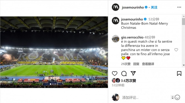 罗马主帅穆里尼奥在社交媒体上晒出罗马奥林匹克体育场的照片,并用意大利语、葡萄牙语、英语写道:“圣诞快乐。”