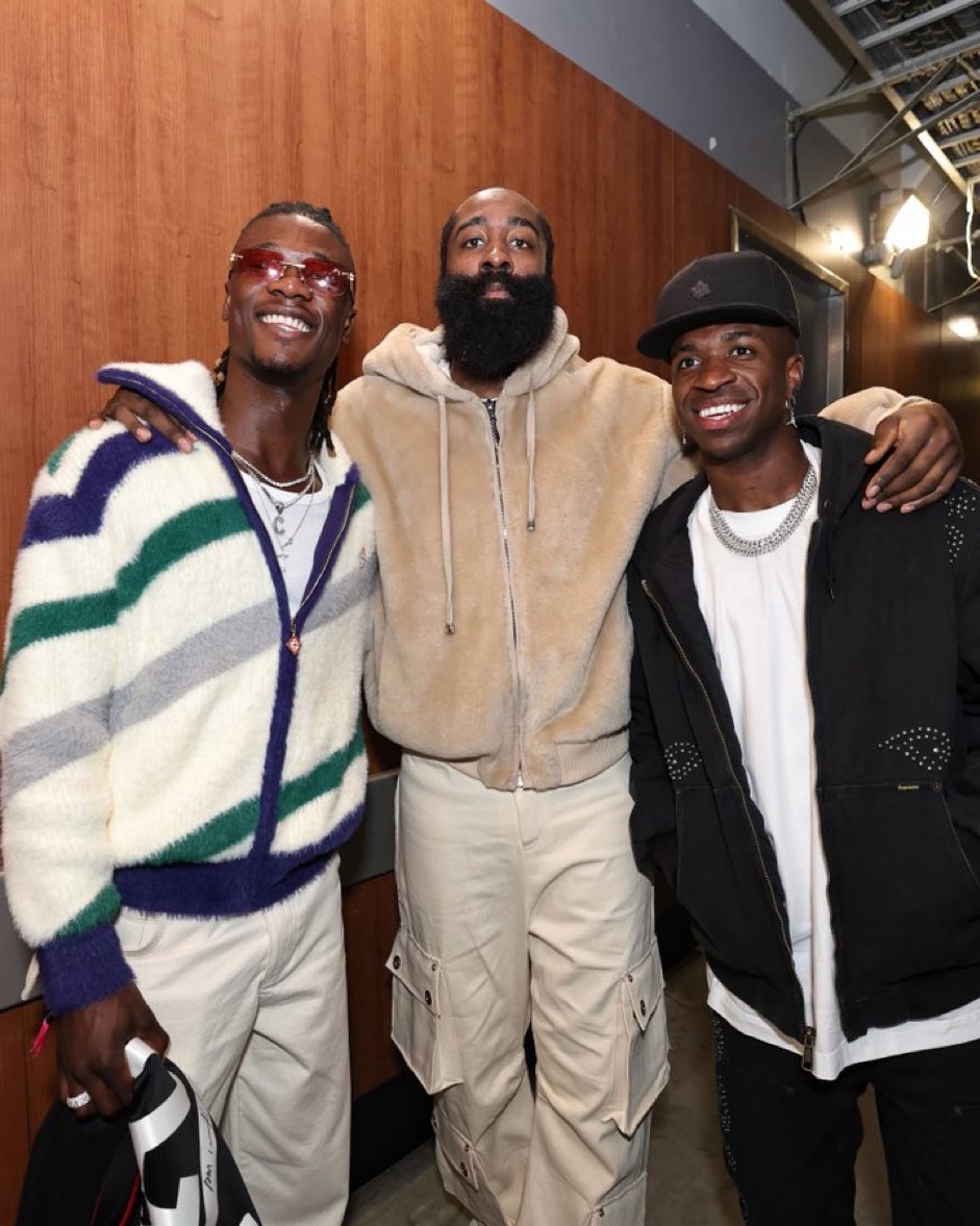 输球不开心☹️哈登与维尼修斯、卡马文加合影,登哥面无表情