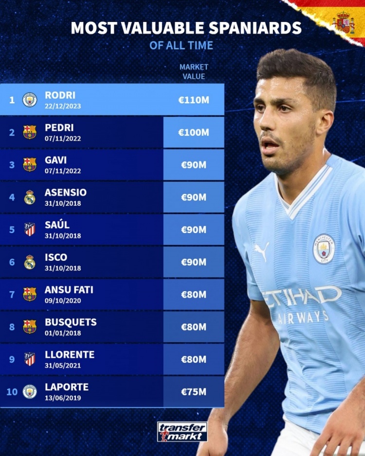 12月24日讯 德转统计了西班牙球员历史最高身价榜单,罗德里1.1亿欧是最高的,佩德里1亿欧第2高。