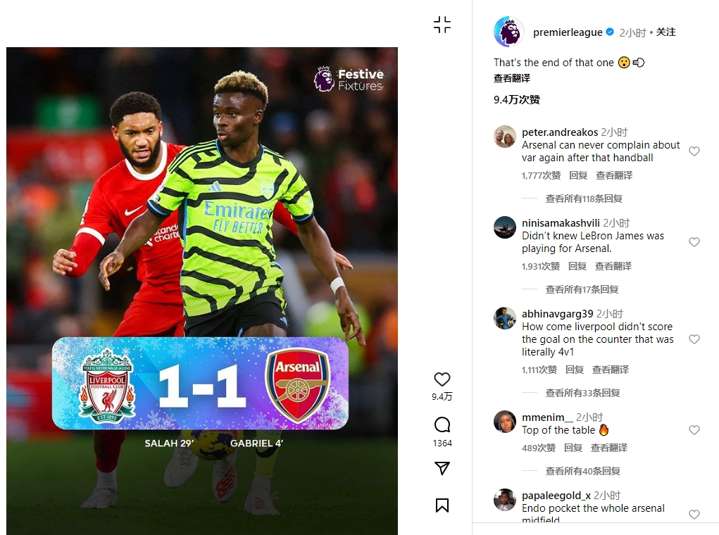 英超第18轮,利物浦主场1-1战平阿森纳,本场比赛厄德高有一次禁区内的明显手球,但裁判没有判罚。赛后在英超的官方社媒下,球迷们也对这次判罚发表了看法。