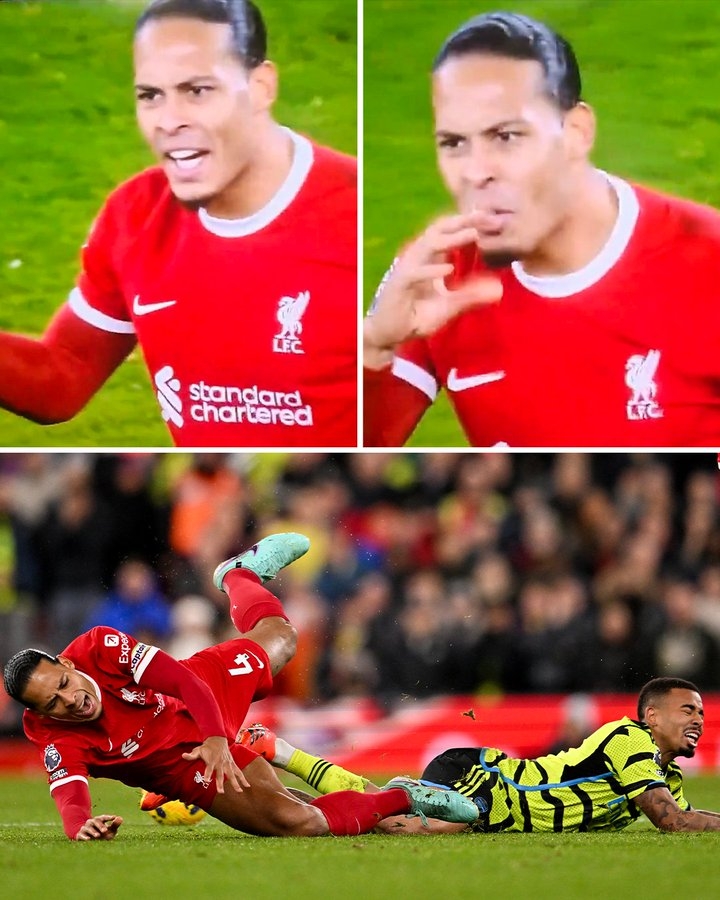 比赛中,热苏斯与范迪克一次对抗后双双倒地,裁判将球权判给阿森纳,范迪克对这个判罚表示不满,他对裁判比出了喝酒的手势,并且嘴上说着什么。