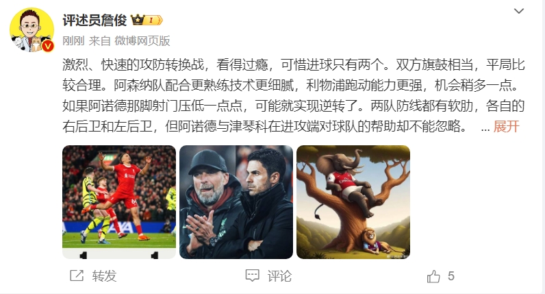 12月24日讯 本轮英超,利物浦1-1战平阿森纳,赛后评述员詹俊发文点评。詹俊:激烈、快速的攻防转换战,看得过瘾,可惜进球只有两个。双方旗鼓相当,平局比较合理。阿
