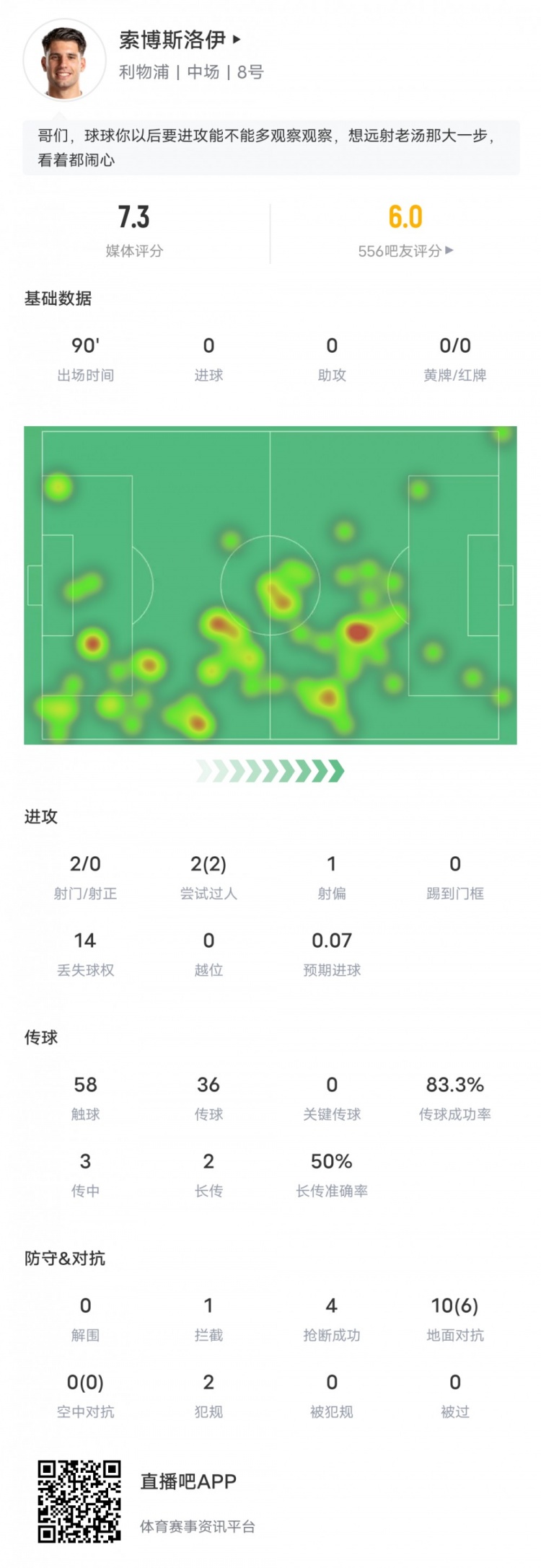 12月24日讯 英超第18轮,利物浦主场1-1战平阿森纳。此役利物浦中场索博斯洛伊首发踢满全场。以下为索博斯洛伊本场具体数据:2次射门2次过人2次成功14次丢失球