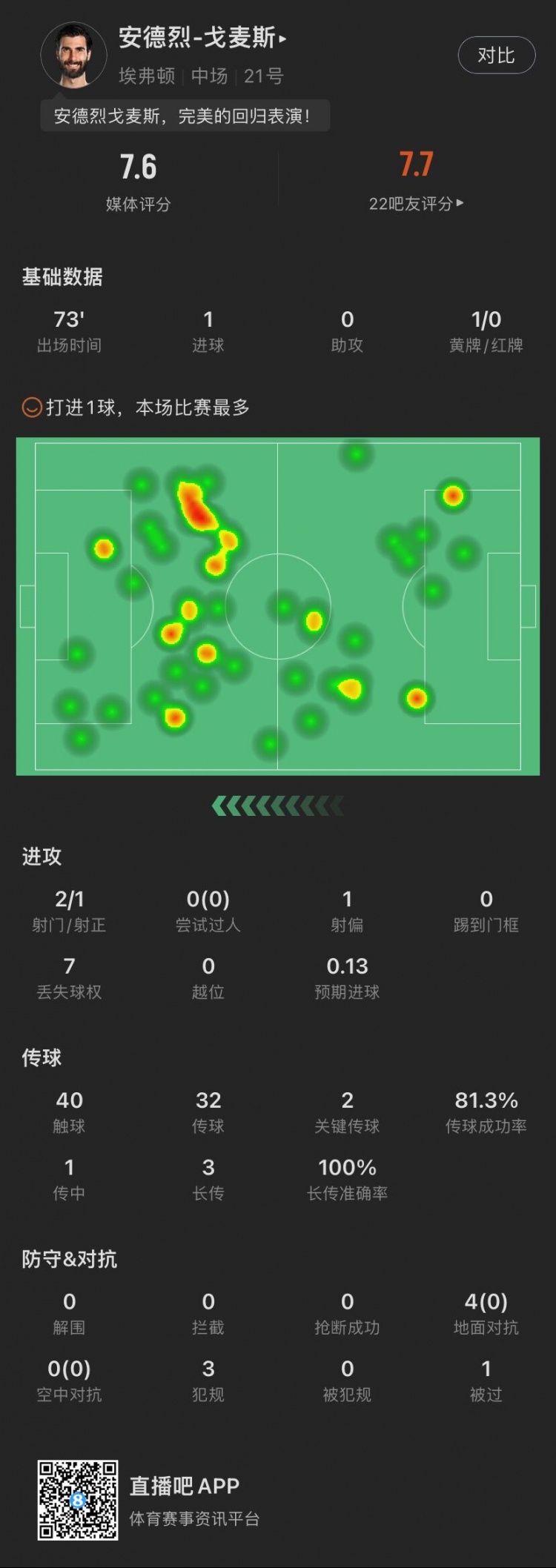 安德烈-戈麦斯本场主要数据↓