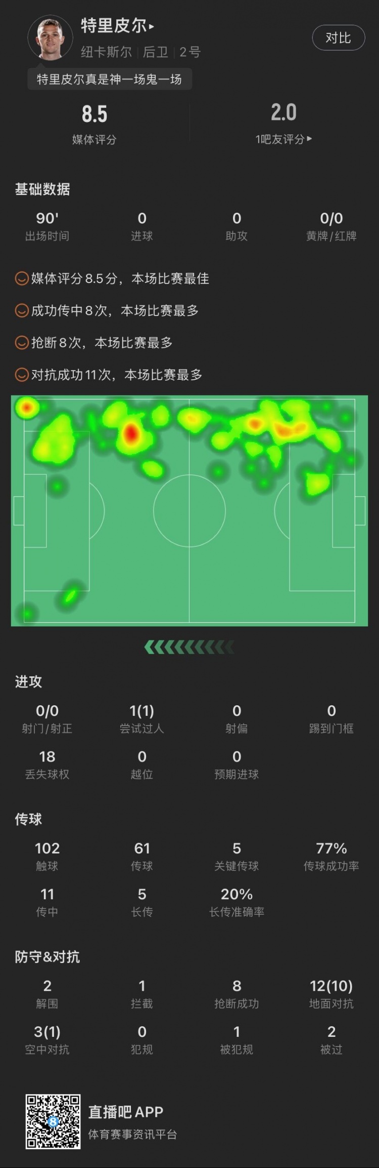 12月24日讯 英超第17轮,纽卡客场0-1不敌升班马卢顿。本场比赛,虽然没能帮助球队取胜,但纽卡边卫特里皮尔发挥十分出色,而上一场对阵切尔西他状态糟糕。特里皮