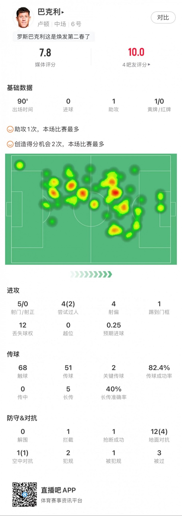 12月24日讯 英超第18轮,卢顿1-0纽卡,卢顿中场罗斯-巴克利全场数据:1次助攻68次触球传球成功率82%2次关键传球5次长传2次到位创造2次得分机会5次射门1次中框0