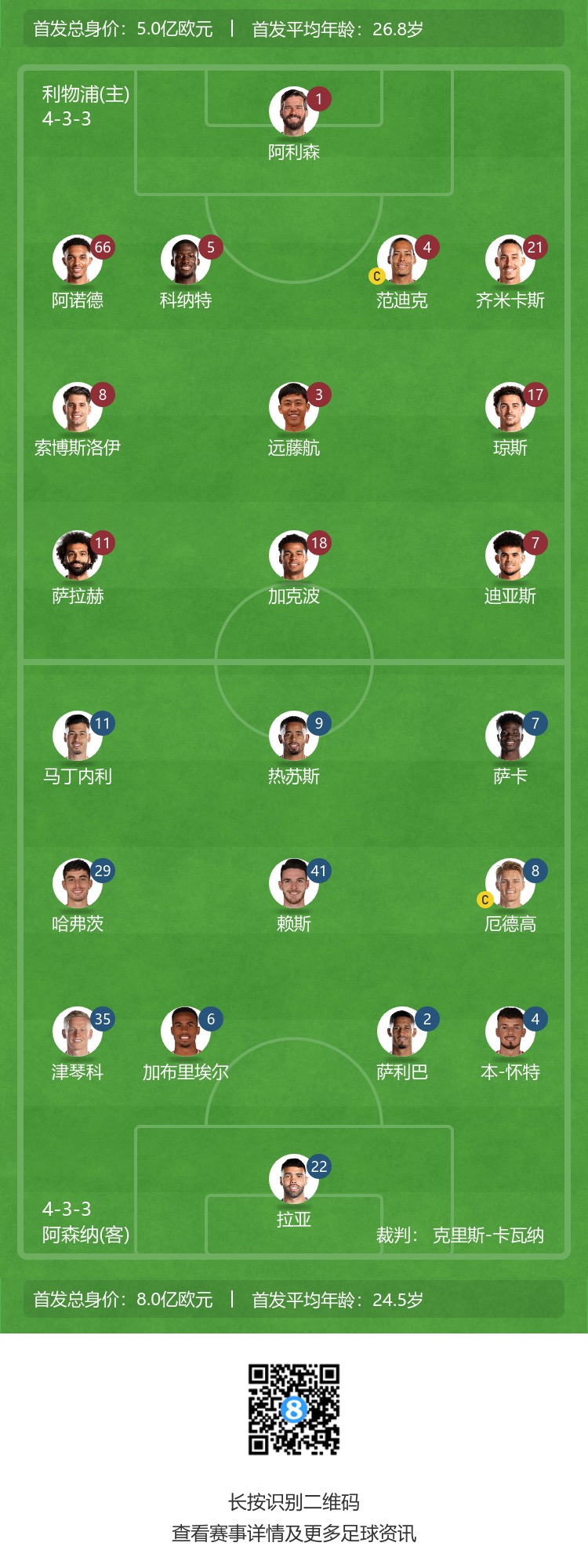 利物浦vs阿森纳首发:琼斯、加克波先发,萨卡、哈弗茨出战