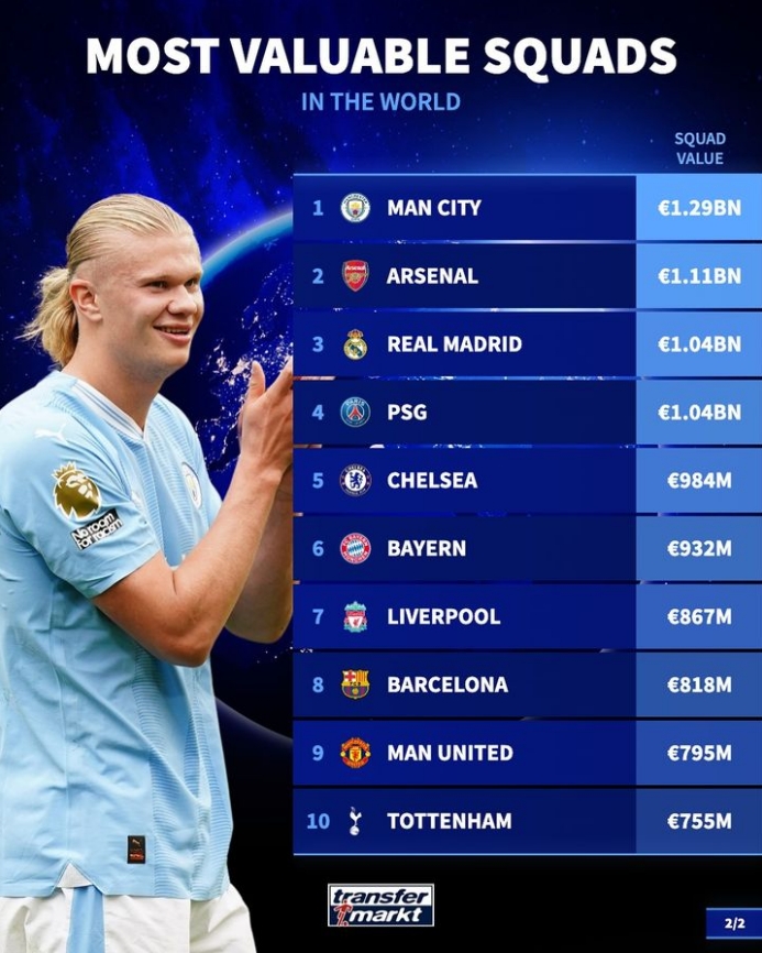 12月25日讯 新一期球员身价更新后,德转列出了当今足坛身价最高的二十支俱乐部阵容。曼城以12.9亿欧居首,阿森纳、皇马和巴黎分列二至四位,他们的阵容身价均超