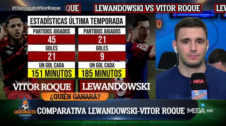 12月27日讯 18岁巴西前锋罗克明年1月正式加盟巴萨,西班牙六台对比了罗克和莱万本赛季的数据。