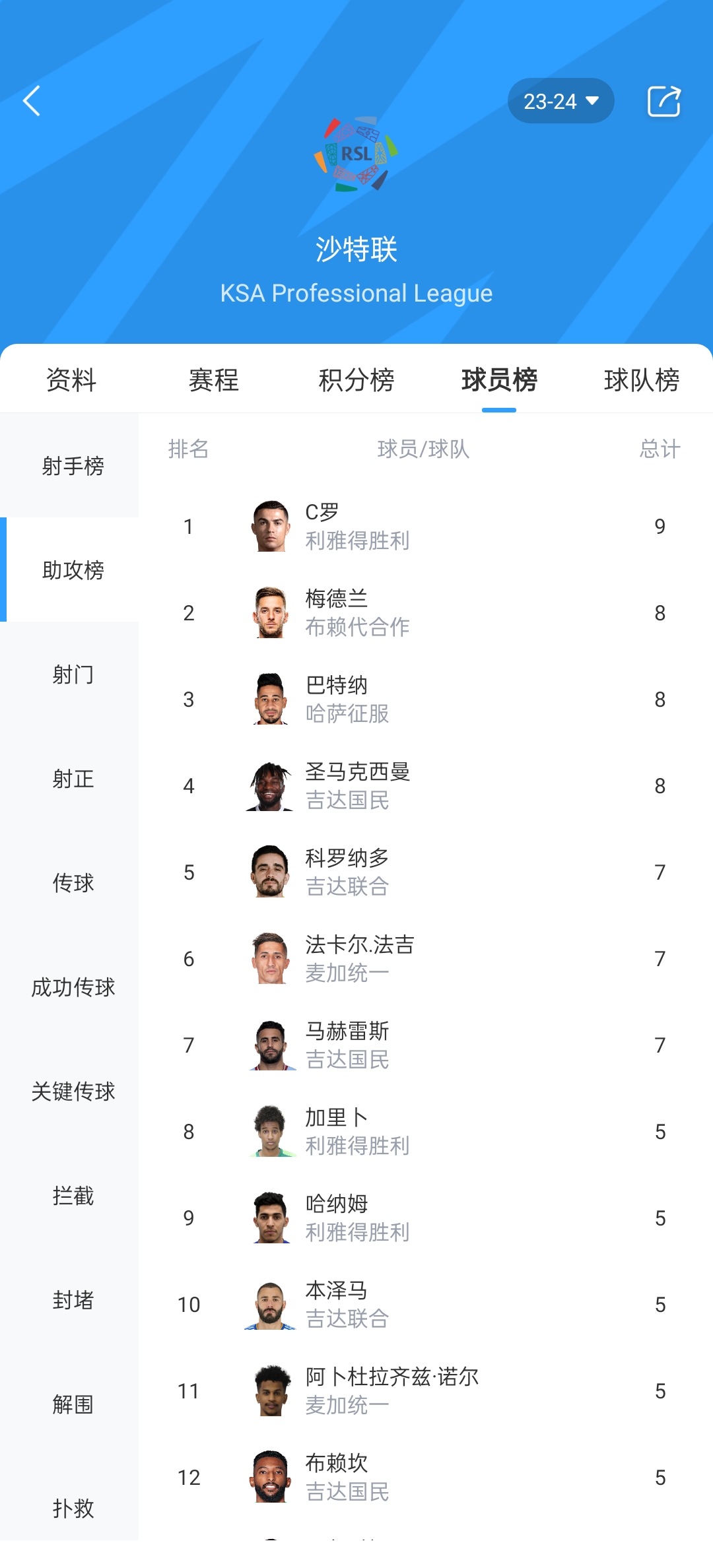 38岁C罗本赛季沙特联19球9助攻,继续领跑射手榜和助攻榜。