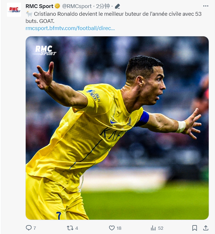 C罗53球登顶2023射手榜,法媒RMC发文猛夸:GOAT