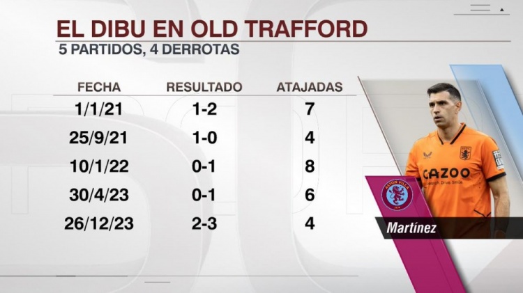 据ESPN统计,维拉门将马丁内斯职业生涯至今5次作客老特拉福德,输掉其中4场。