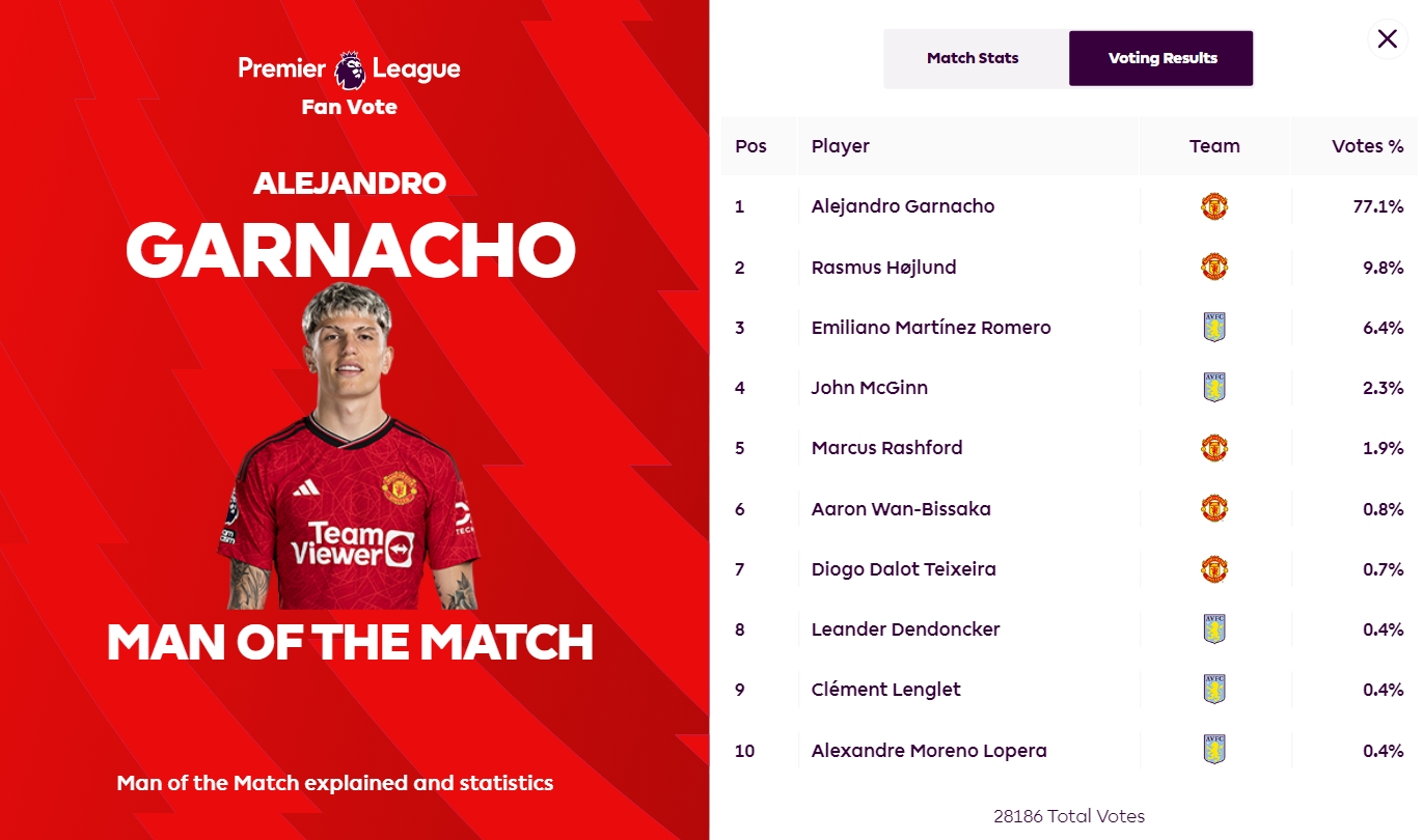 本场比赛,加纳乔4次射门2次射正,打进两球,为曼联的逆转埋下伏笔,赛后,他在投票中压过队友霍伊伦,被评为全场最佳。