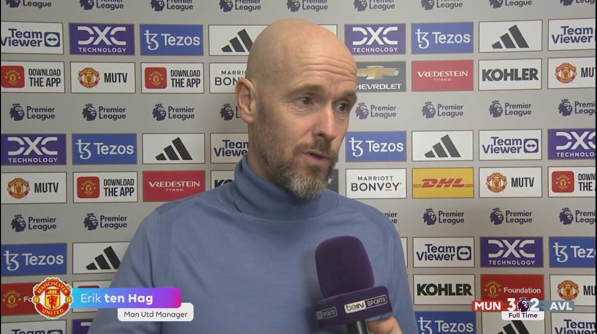 12月27日讯 在刚刚结束的英超第19轮比赛中,曼联3-2逆转击败阿斯顿维拉。赛后,滕哈赫接受了BBC的采访,谈到了进球功臣加纳乔和霍伊伦,以及对拉特克利夫爵士收购