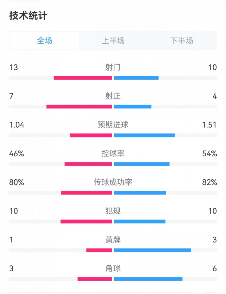 12月27日讯 本轮英超,曼联主场3-2逆转维拉,双方全场数据对比如下(曼联在前)↓射门13-10射正7-4预期进球1.04-1.5146%-54%传球成功率80%-82%犯规10-10黄牌1-3角