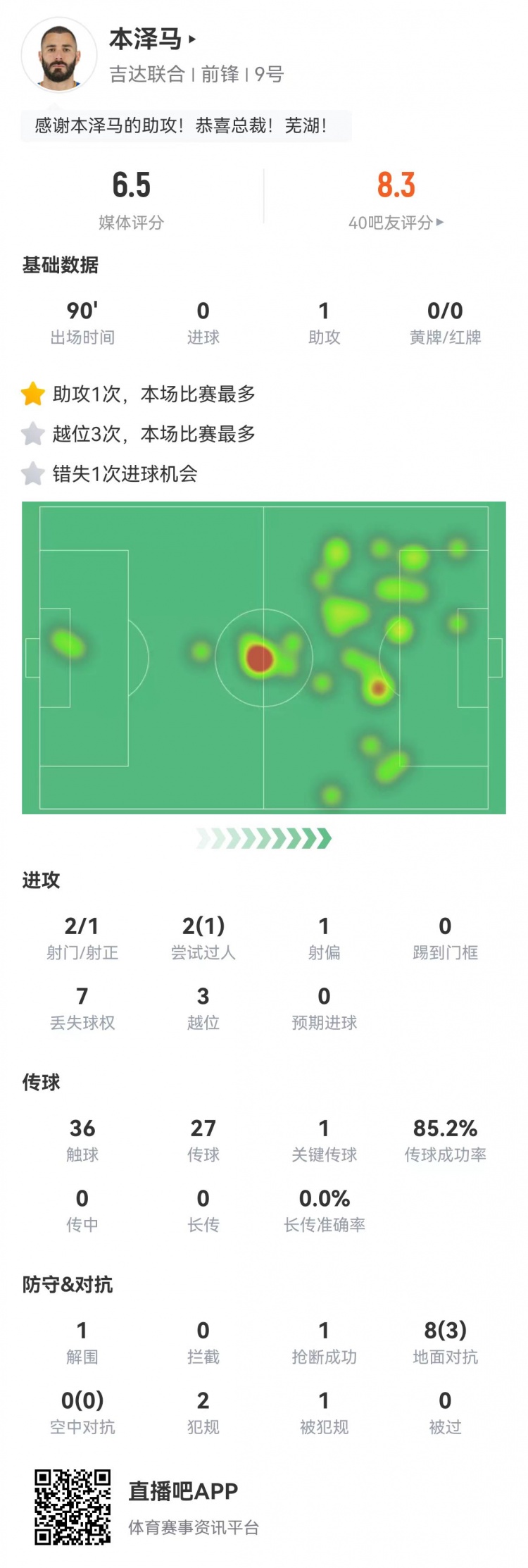 数据方面,本泽马全场比赛1次送点,1次助攻;2脚射门,1射正;2次尝试过人,1成功;3次越位;8次地面对抗,3次成功;评分6.5分。