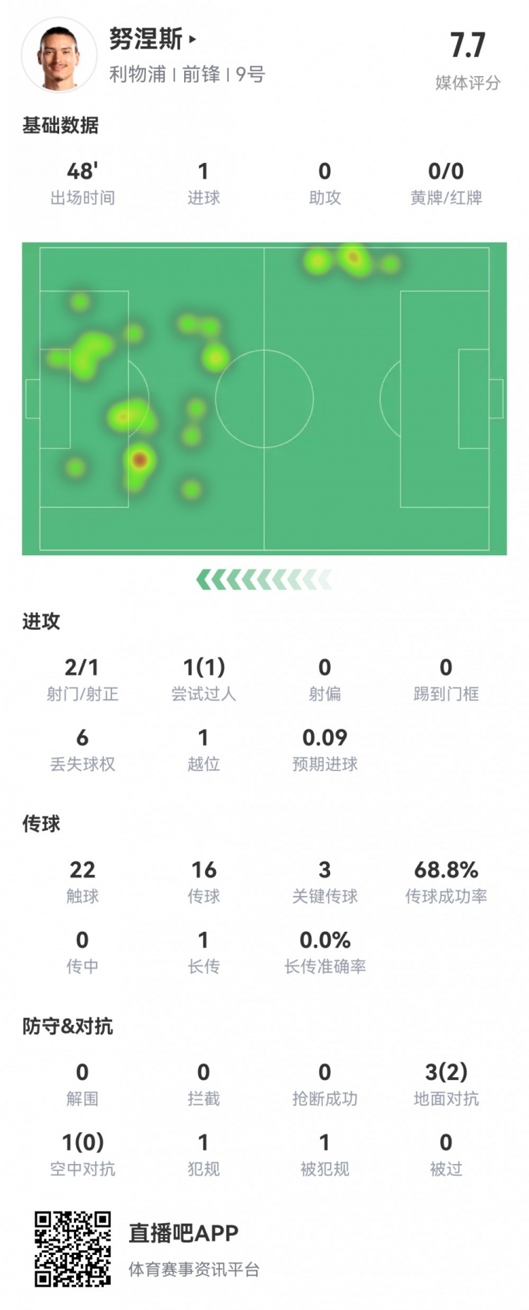 半场数据方面,努涅斯2次射门1次射正,3次关键传球,评分7.7。