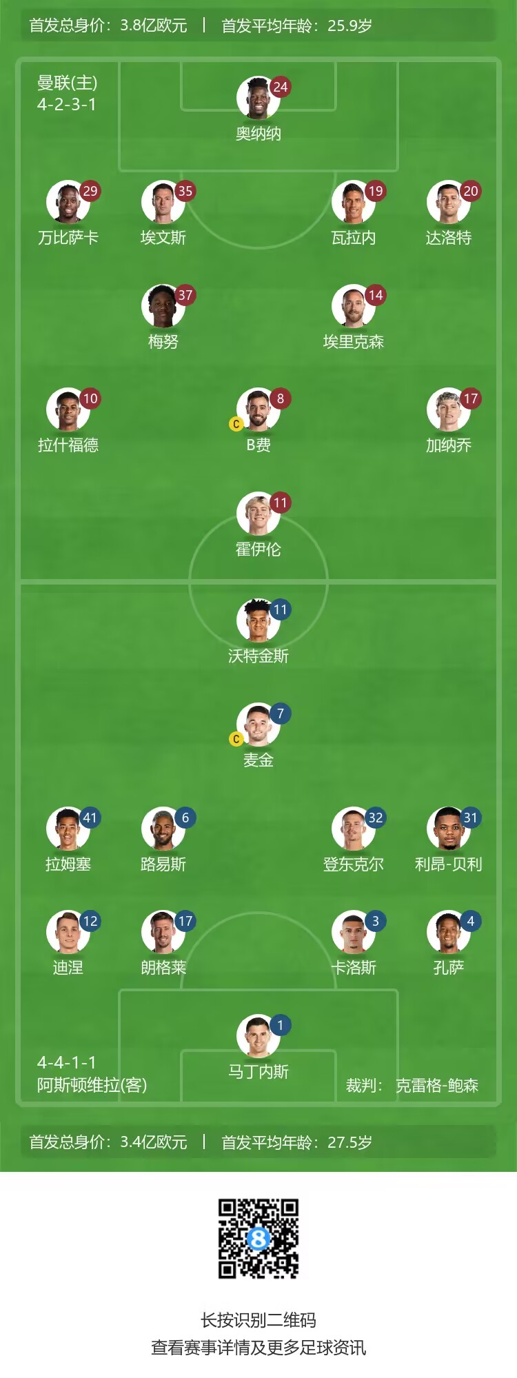 曼联首发:24-奥纳纳、29-万-比萨卡、19-瓦拉内、35-乔尼-埃文斯20-达洛特、37-梅努、14-埃里克森、8-B费、10-拉什福德、17-加纳乔、11-霍伊伦