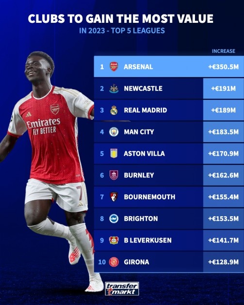 今年各队阵容升值榜:阿森纳涨3.5亿欧居首,皇马第三曼城第四