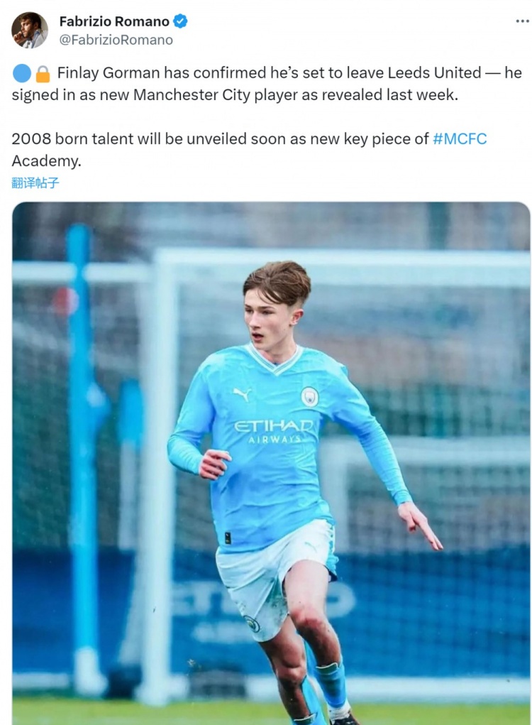 罗马诺:利兹联15岁中场戈尔曼加盟曼城青训,官宣很快到来