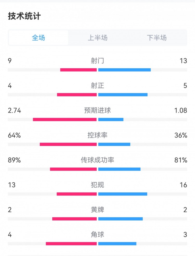 切尔西2-1水晶宫全场数据对比:射门9-13,预期进球2.74-1.08