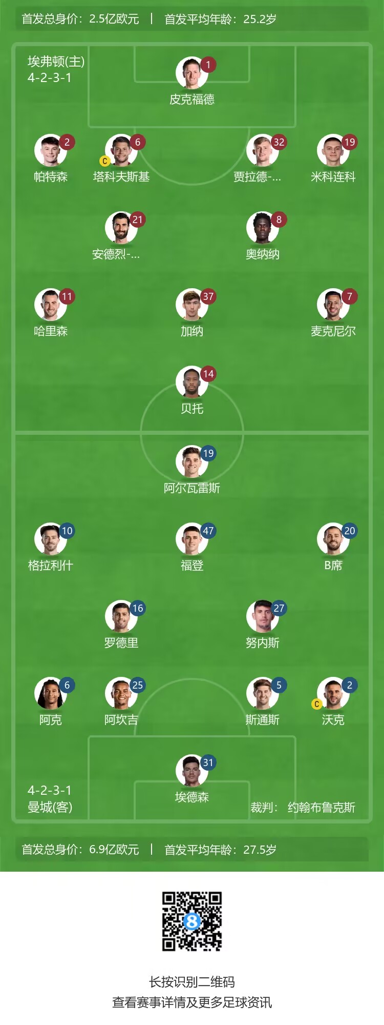 曼城vs埃弗顿首发:小蜘蛛、格拉利什先发 B席出战、哈兰德缺阵