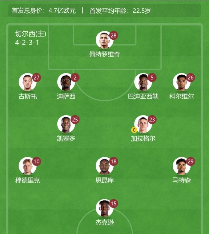切尔西本场首发:佩特洛维奇、古斯托、迪萨西、巴迪亚西勒、科尔维尔、凯塞多、加拉格尔、马特森、恩昆库、穆德里克、杰克逊。