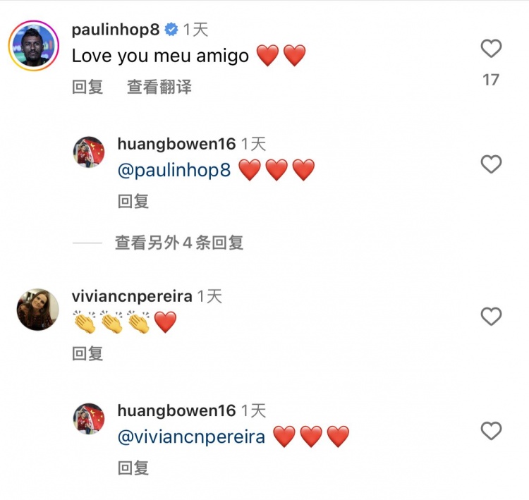 黄博文社媒晒合影,保利尼奥回复:爱你,我的兄弟