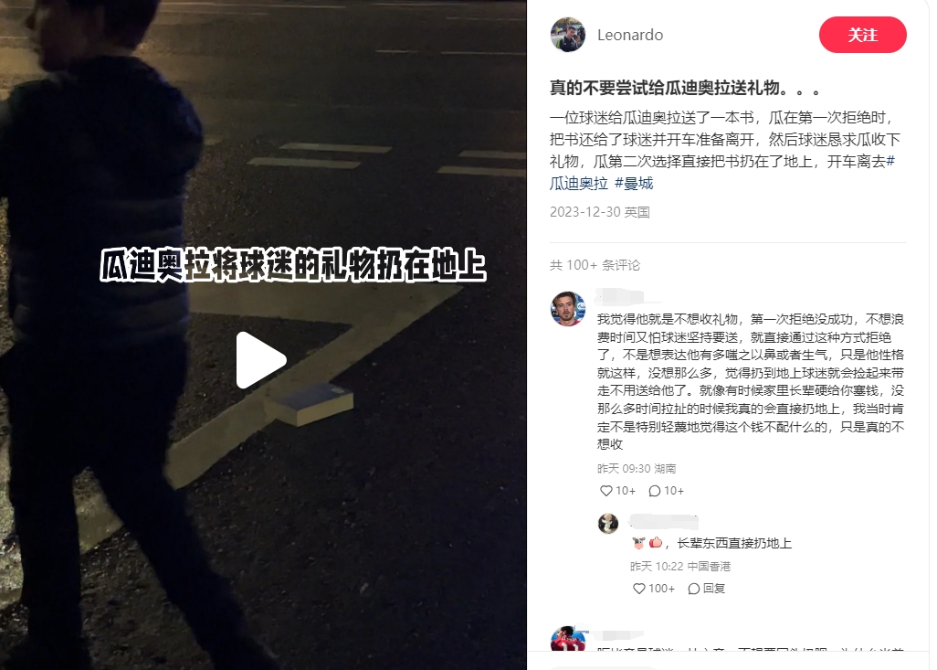 网友@Leonardo晒出一段视频,一球迷给瓜迪奥拉送了一本书,瓜迪奥拉第一次拒绝,把书还给了球迷并开车准备离开。然后球迷恳求瓜收下礼物,瓜迪奥拉第二次直接选择把书仍在了地上。