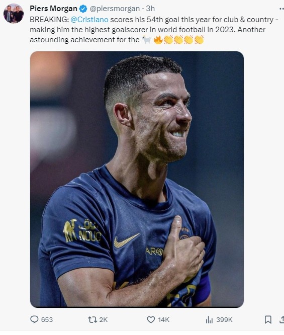 皮尔斯-摩根表示道:C罗为俱乐部和国家队打进了他今年的第54粒进球,使得他成为了2023年世界足坛进球最多的球员。这是另一个令人震惊的成就