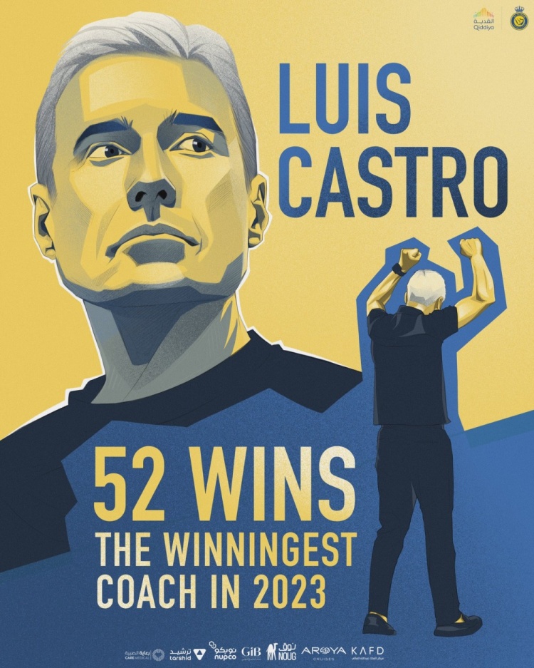 利雅得胜利官方表示,球队主教练卡斯特罗在今年拿到了52胜,成为在今年胜场数最多的主教练。