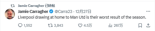 赛后卡拉格再次转发几天前自己发布的推特:利物浦主场战平曼联是他们本赛季最糟糕的一场比赛结果。