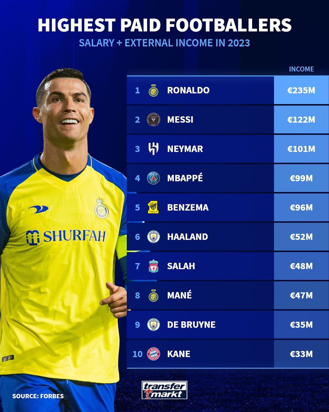 足坛2023总收入排行:C罗2.35亿欧断层第一,梅西内少二三名