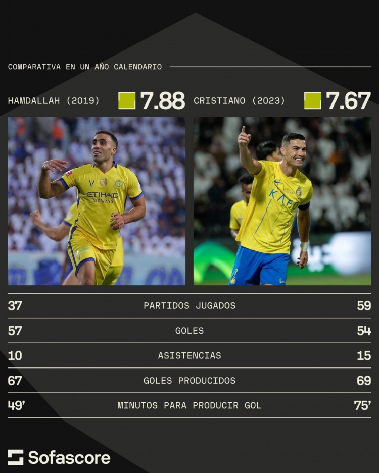 数据机构Sofascore对比了今年C罗和2019年哈姆达拉的数据。在2019年,当时也是效力利雅得胜利的哈姆达拉以57球成为该年份的年度射手王。