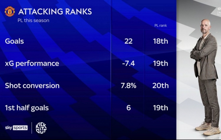 曼联英超本赛季打进22球排倒数第三,射门转化率7.8%倒数第一