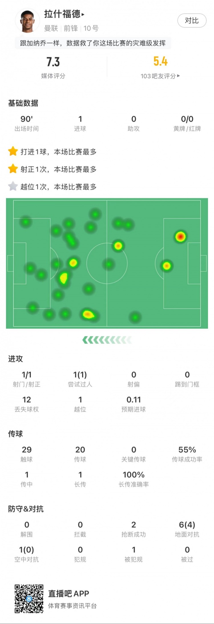 拉什福德本场数据:1次射门1粒进球,2次抢断,7次对抗赢得4次
